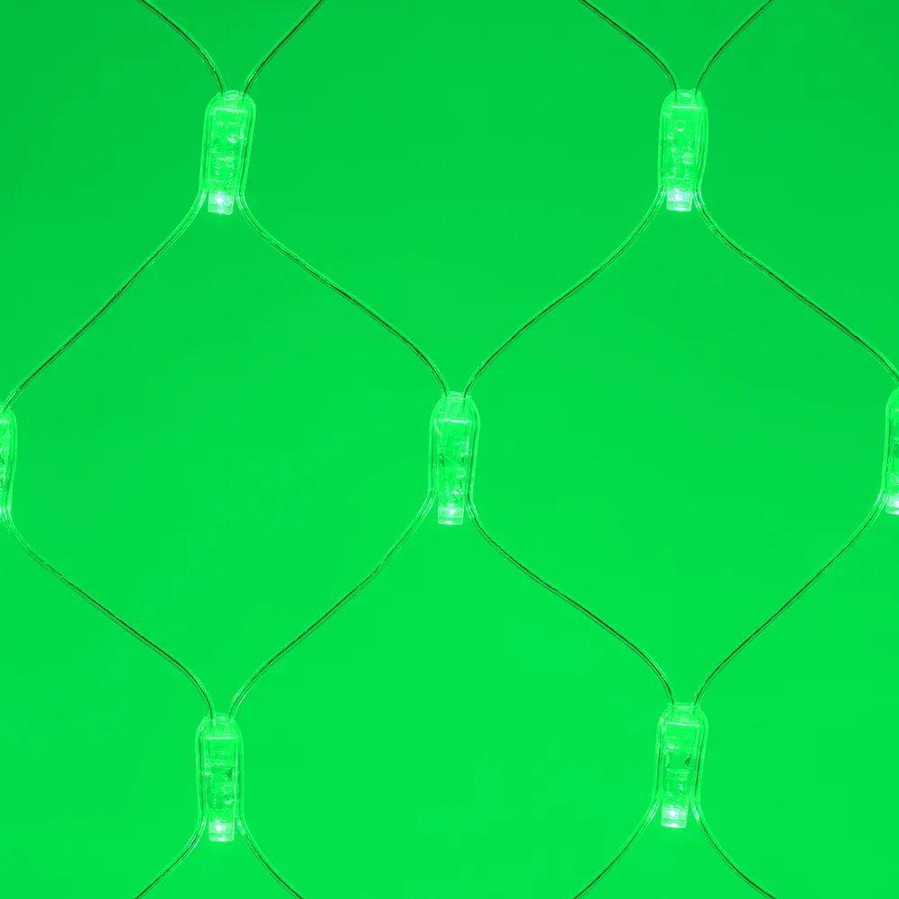 Светодиодная сеть Classic. 2000x1500 (длина 2000 мм, высота 1500 мм). Цвет свечения ЗЕЛЕНЫЙ. 288 светодиодов размером 7 мм со статическим и 8 динамическими эффектами свечения с резким световым рисунком (прозрачная вогнутая линза). Провод прозрачный, ПВХ. Питание 230 В, Мощность 18 Вт,защита IP65, применение в помещении и на улице под навесом Аксессуары для подключения и выбора режима свечения в комплекте.