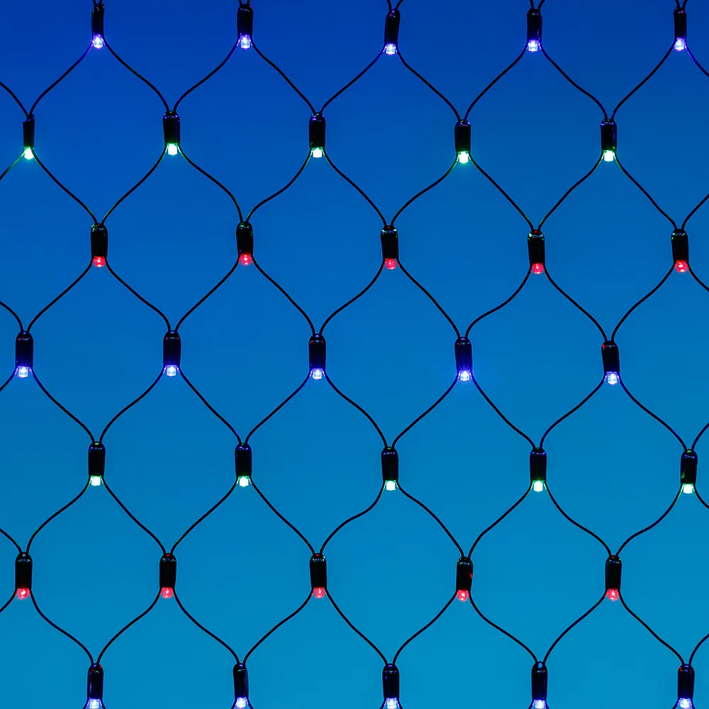 Светодиодная сеть Classic. 2000x1500 (длина 2000 мм, высота 1500 мм). Цвет свечения RGBY (светодиоды чередуются). 288 светодиодов размером 7 мм со статическим и 8 динамическими эффектами свечения с резким световым рисунком (прозрачная вогнутая линза). Провод черный, ПВХ. Питание 230 В, Мощность 18 Вт,защита IP65, применение в помещении и на улице под навесом Аксессуары для подключения и выбора режима свечения в комплекте.