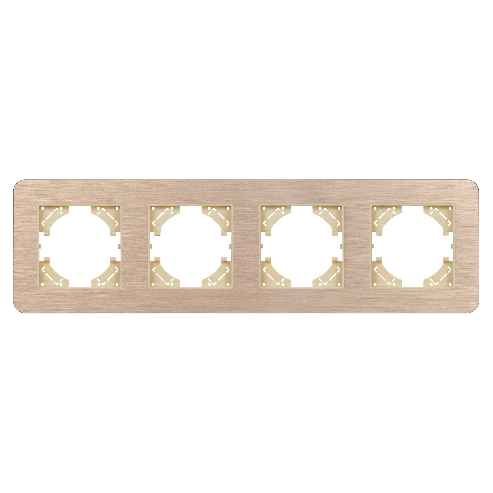 Рамка алюминиевая на 4 поста, под встраиваемый механизм. Цвет - золотой. Уровень герметичности IP20. Ориентация монтажа - горизонтальная (основным ориентиром служат посадочные выступы для накладки механизма). Габаритные размеры: длина 299 мм, ширина 86 мм, высота 7 мм. Гарантийный срок 12 мес.